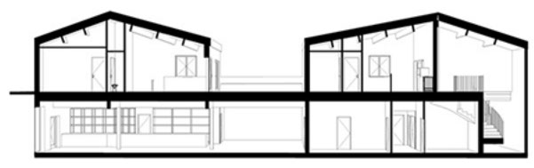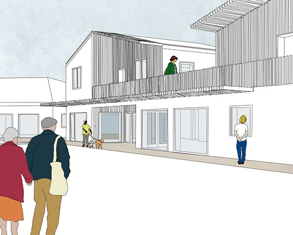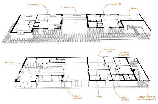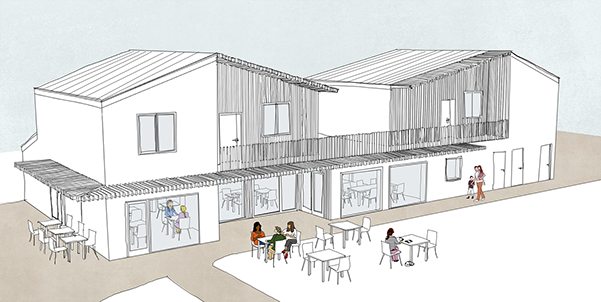 Situé sur la place de l'église, entre le presbytère et un cabinet médical, ce projet propose des nouveaux commerces en RDC et deux logements à l'étage pour participer à l'animation et le réaménagement de cette place majeure. Le restaurant / bar s'ouvre sur la place par de grandes baies, tandis que pour préserver l'intimité des logements, ceux-ci sont tournés vers leurs espaces extérieurs respectifs (une terrasse pour le T3 et une loggia pour le T2). L'ensemble des bâtiments sont traités en ossature bois et un bardage bois vient se dérouler tantôt en garde corps, tantôt en pergola pour se glisser dans les interstices.