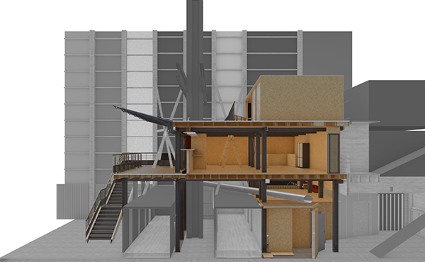 Voilà un projet particulier dans la production de l’agence mca. Un projet passion, co-conçu avec les passionnés de la Compagnie La Machine, concepteurs et constructeurs d’éléphants et autres animaux fantastiques qui sillonnent Nantes, Toulouse, Yokohama, Pékin, Ottawa ou Calais. Le projet consiste en la création de locaux de vestiaires et cafétéria à destination des constructeur.e.s de la Compagnie, mais aussi la création d’un belvédère destiné au public afin de pouvoir apprécier le travail en cours dans cet atelier d’un autre univers, le tout s’intégrant dans un ERP 1ère catégorie en fonctionnement permanent.