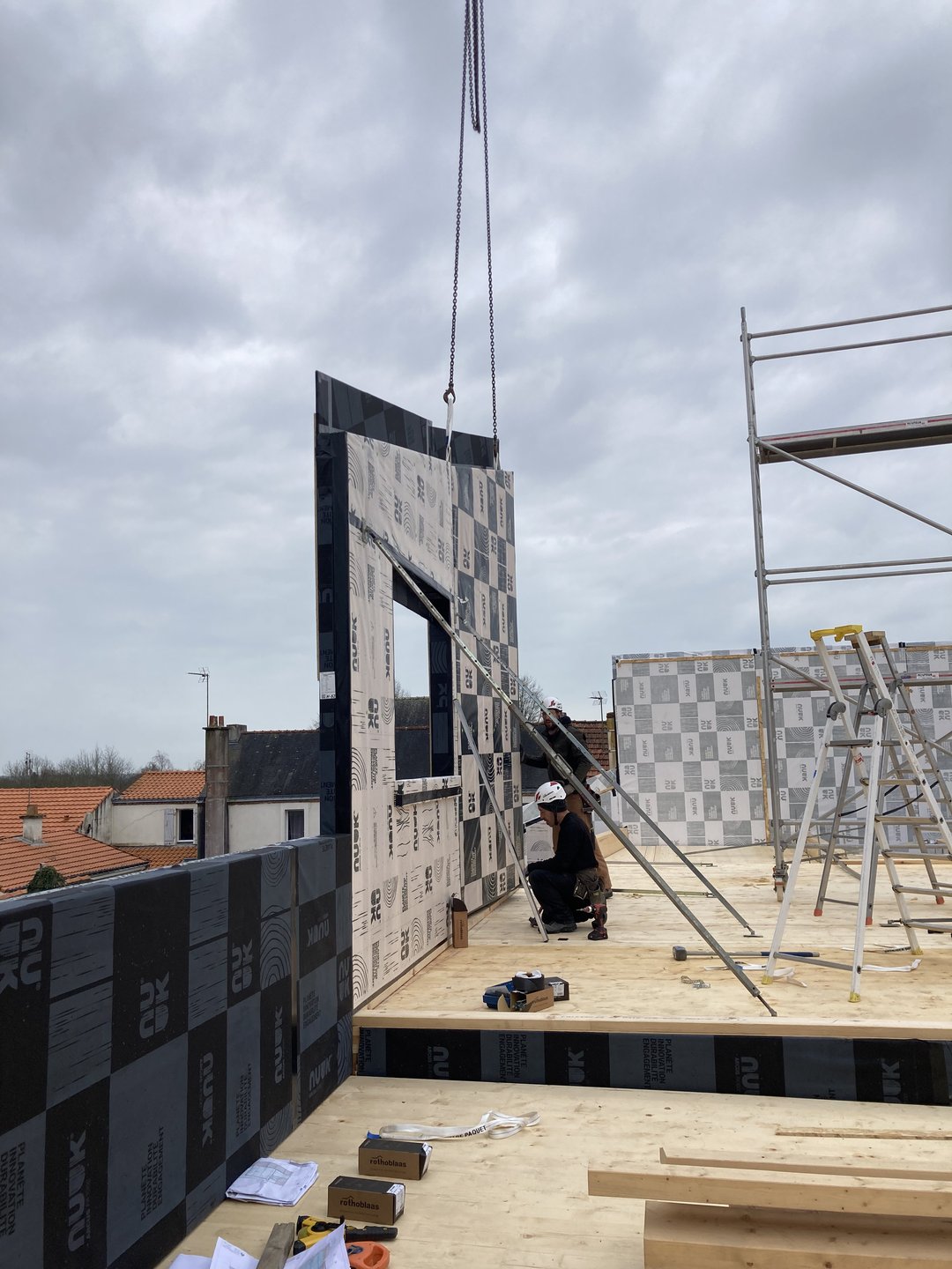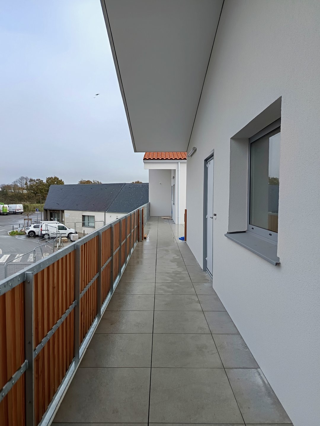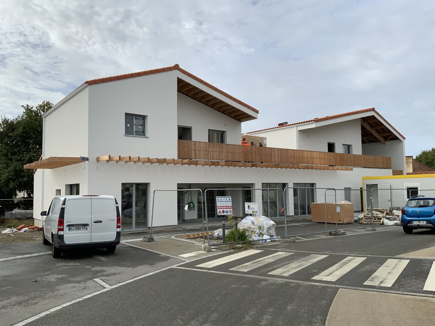 Le restaurant/bar s’ouvre sur la place par de grandes baies, tandis que pour préserver l’intimité des logements ceux ci sont tournés vers leurs espaces extérieurs respectifs (une terrasse pour le T3 et une loggia pour le T2). L’ensemble des bâtiments sont traités en ossature bois et un barreaudage bois vient se dérouler tantôt en garde corps, tantôt en pergola pour se glisser dans les interstices.