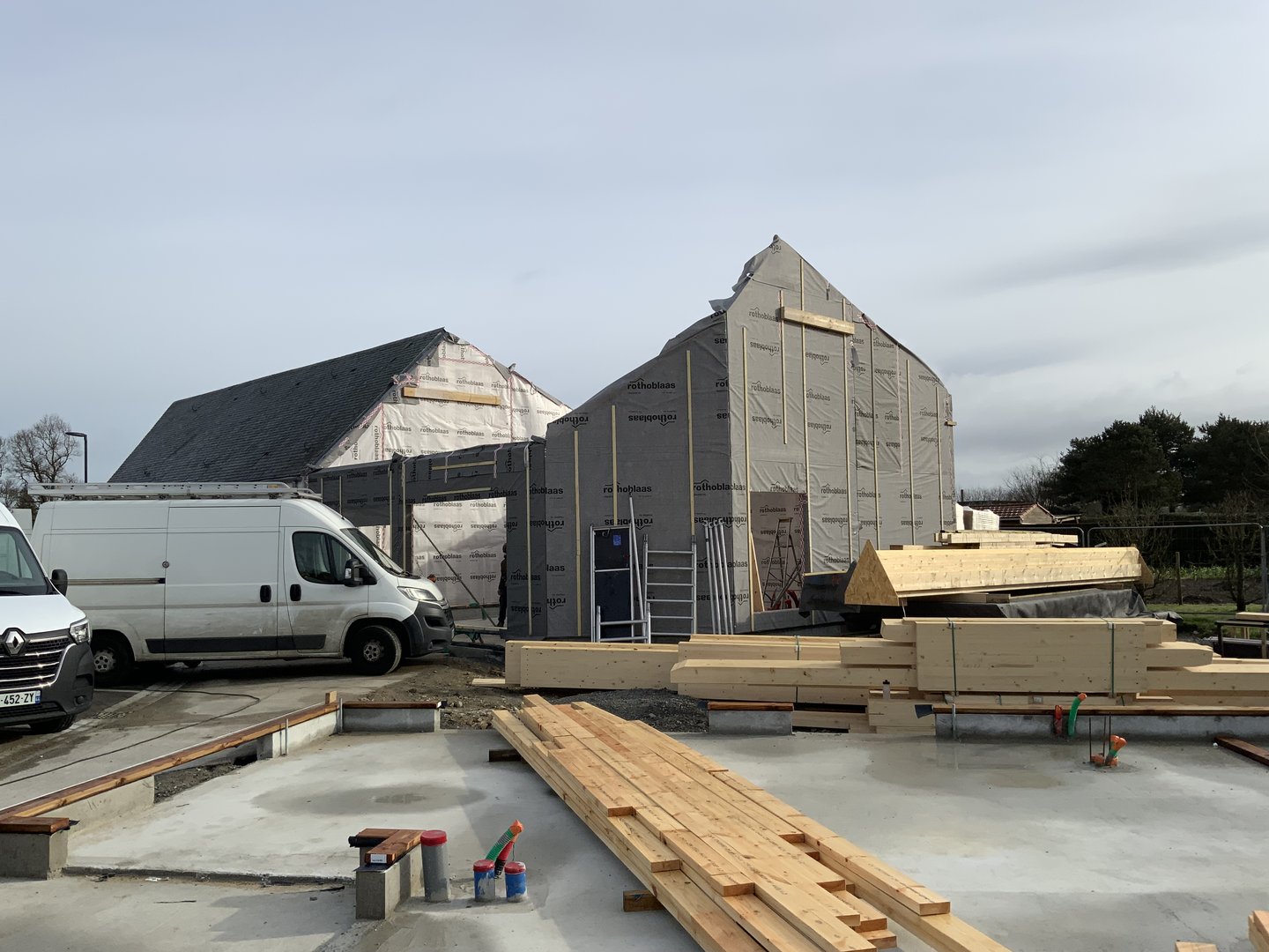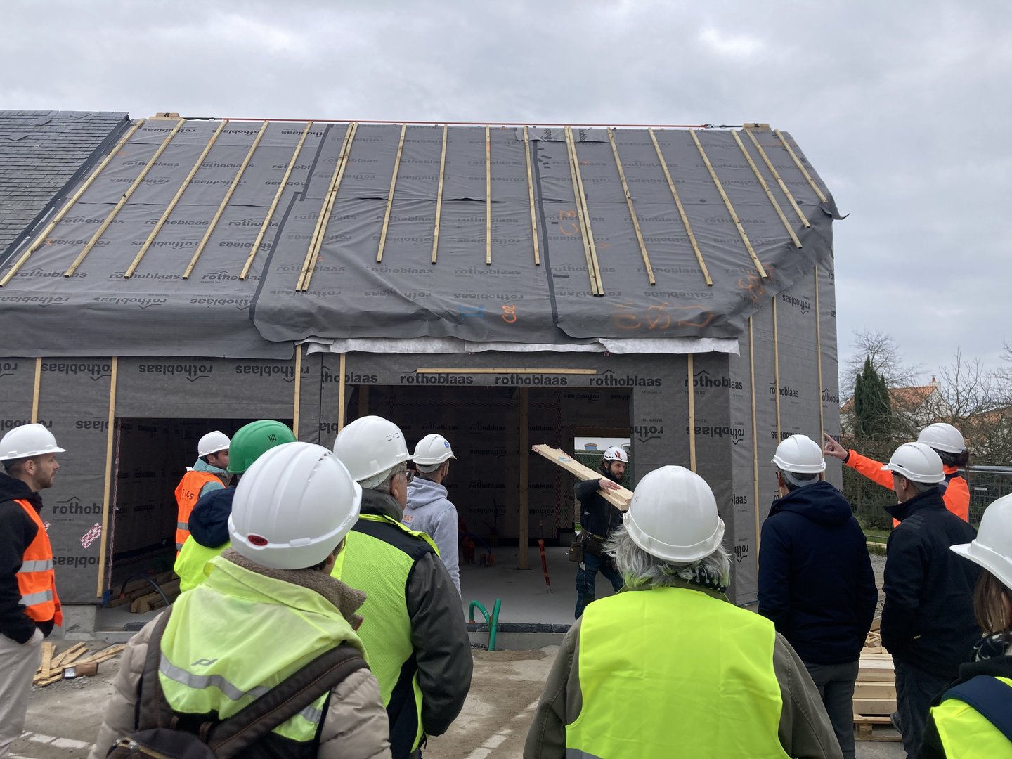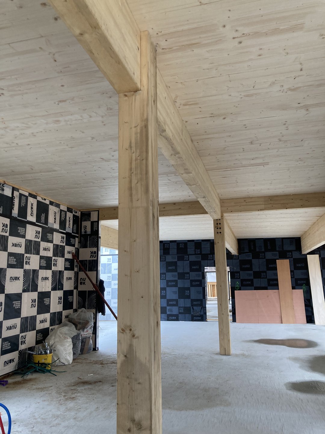Le restaurant/bar s’ouvre sur la place par de grandes baies, tandis que pour préserver l’intimité des logements ceux ci sont tournés vers leurs espaces extérieurs respectifs (une terrasse pour le T3 et une loggia pour le T2). L’ensemble des bâtiments sont traités en ossature bois et un barreaudage bois vient se dérouler tantôt en garde corps, tantôt en pergola pour se glisser dans les interstices.