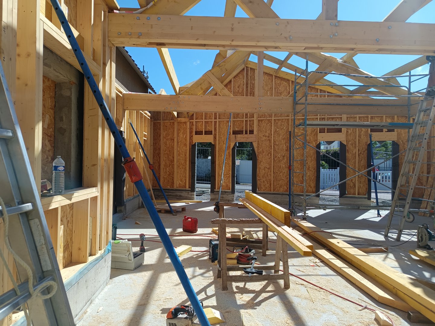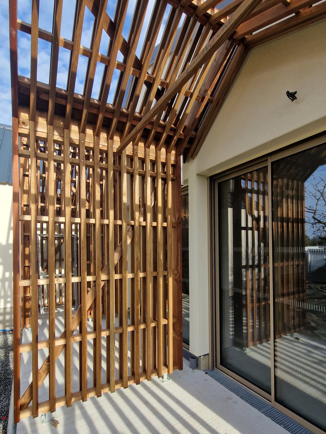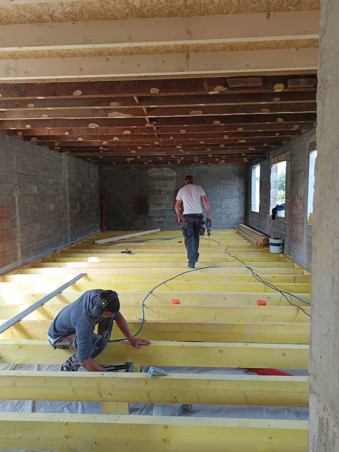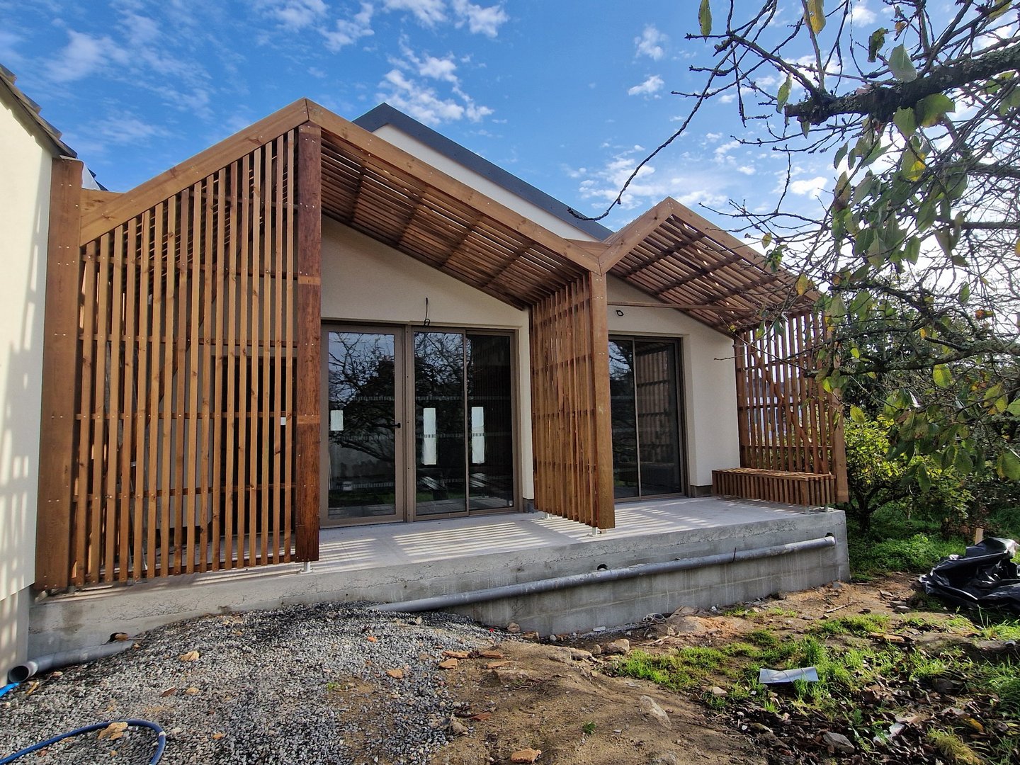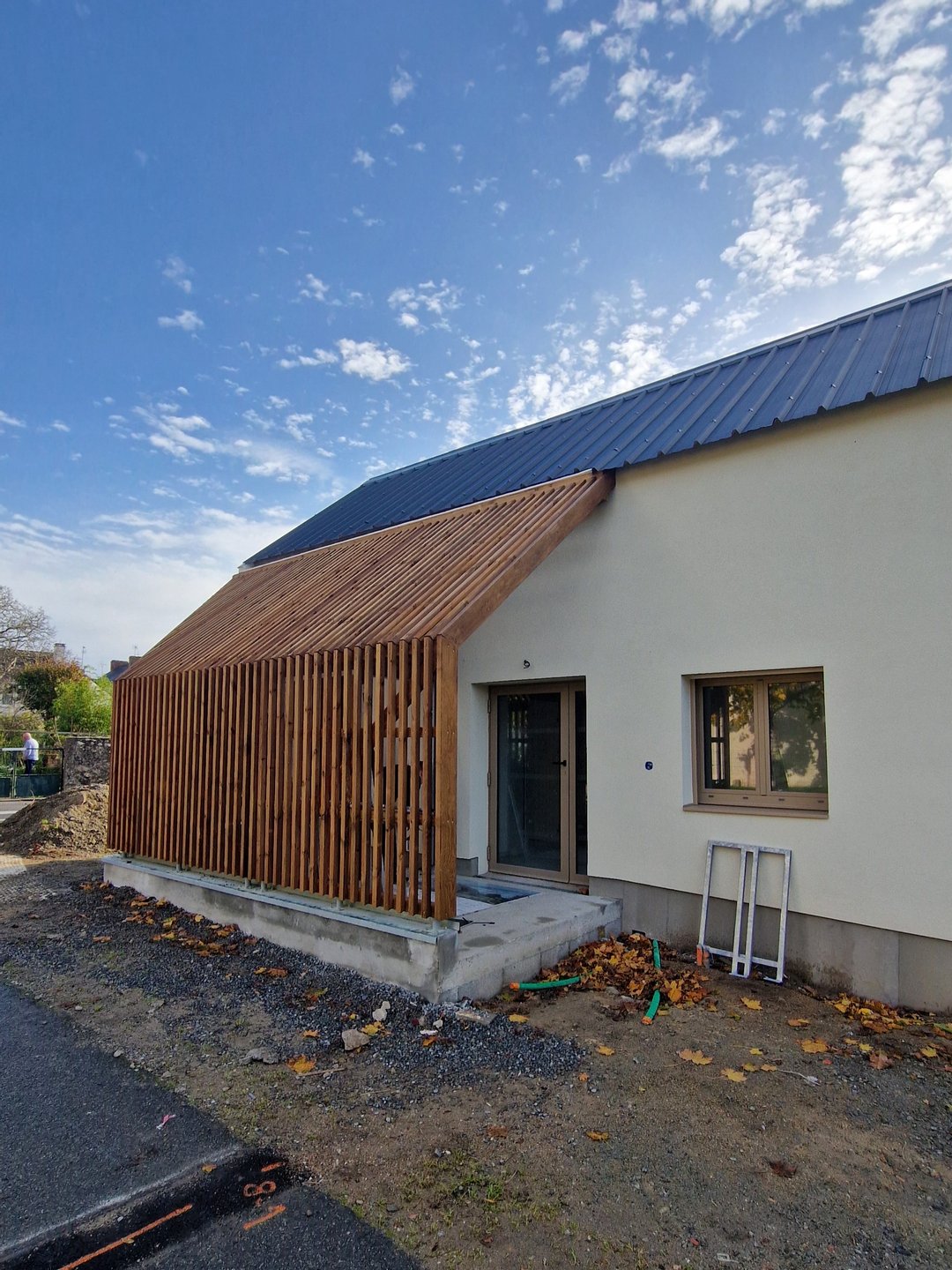 L’ensemble est réalisé avec des matériaux biosourcés : isolation ITE en fibre de bois pour le bâtiment existant, structure en murs ossature bois, isolation fibre de bois pour l’extension.