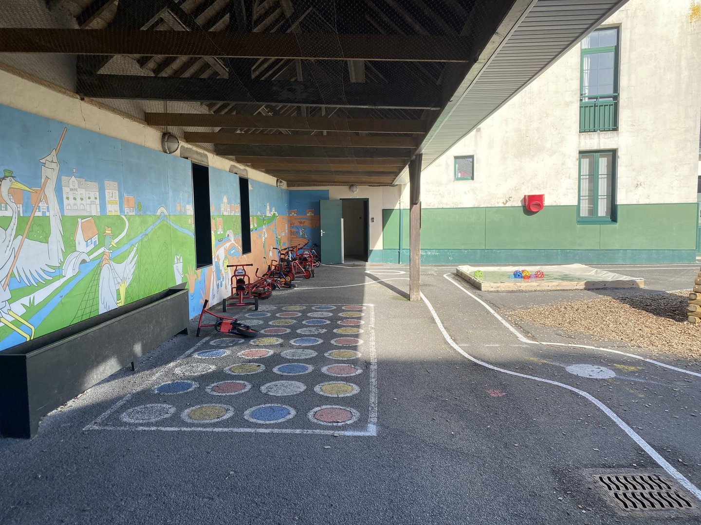 A Aignac, le restaurant scolaire est implanté en continuité du préau existant, la fresque existante et réalisée par les enfants a été décalées pour permettre l’accès au restaurant sans l’abîmer.
